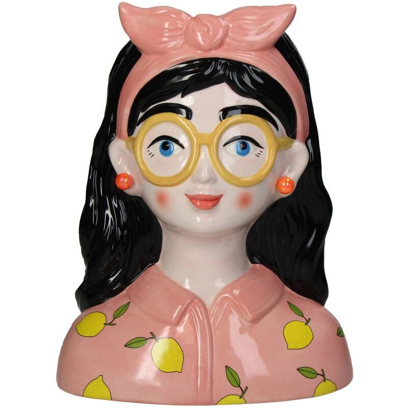 Deze vaas in de vorm van een meisje is er eentje waar je meteen vrolijk van wordt. De combinatie van de roze tinten, citroenprint en opvallende gele bril geeft haar een speelse, bijna illustratieve uitstraling.