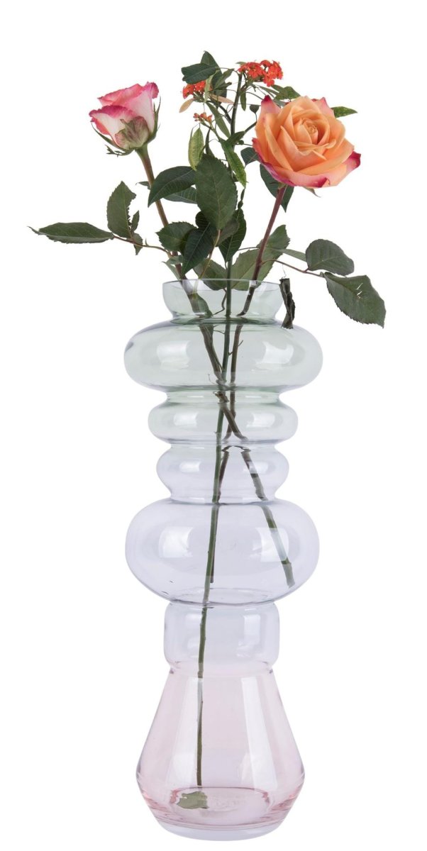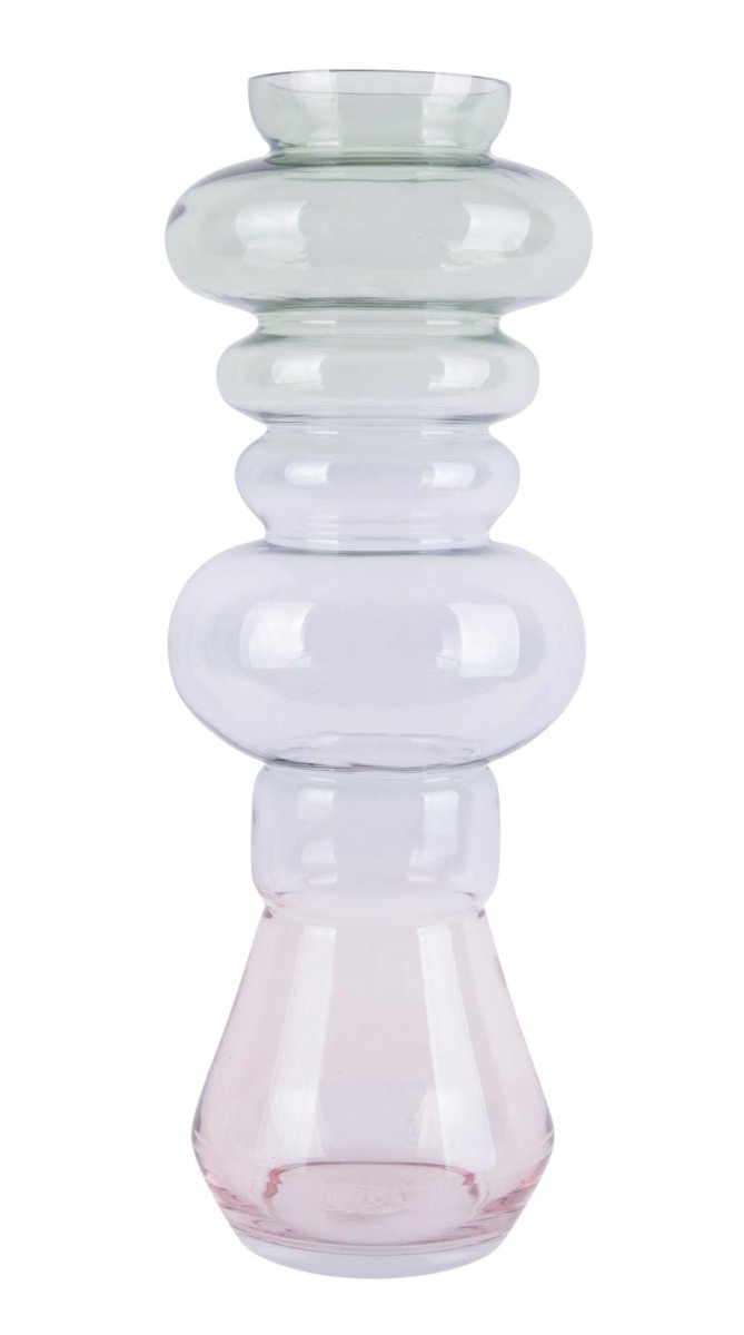 De meeste doorzichtige vazen zijn vaak toch wat simpeler; praktisch maar saai. Dat kan je van deze Morgana niet zeggen. Qua vorm doet deze aan de Italiaanse Memphis vormgeving uit de jaren ’80 denken, zoals je die nu op meer plekken ziet opduiken. Een spannende ‘gestapelde’ glazen doorzichtige vaas. Met zijn 50cm hoogte uitermate geschikt voor lange bloemen.