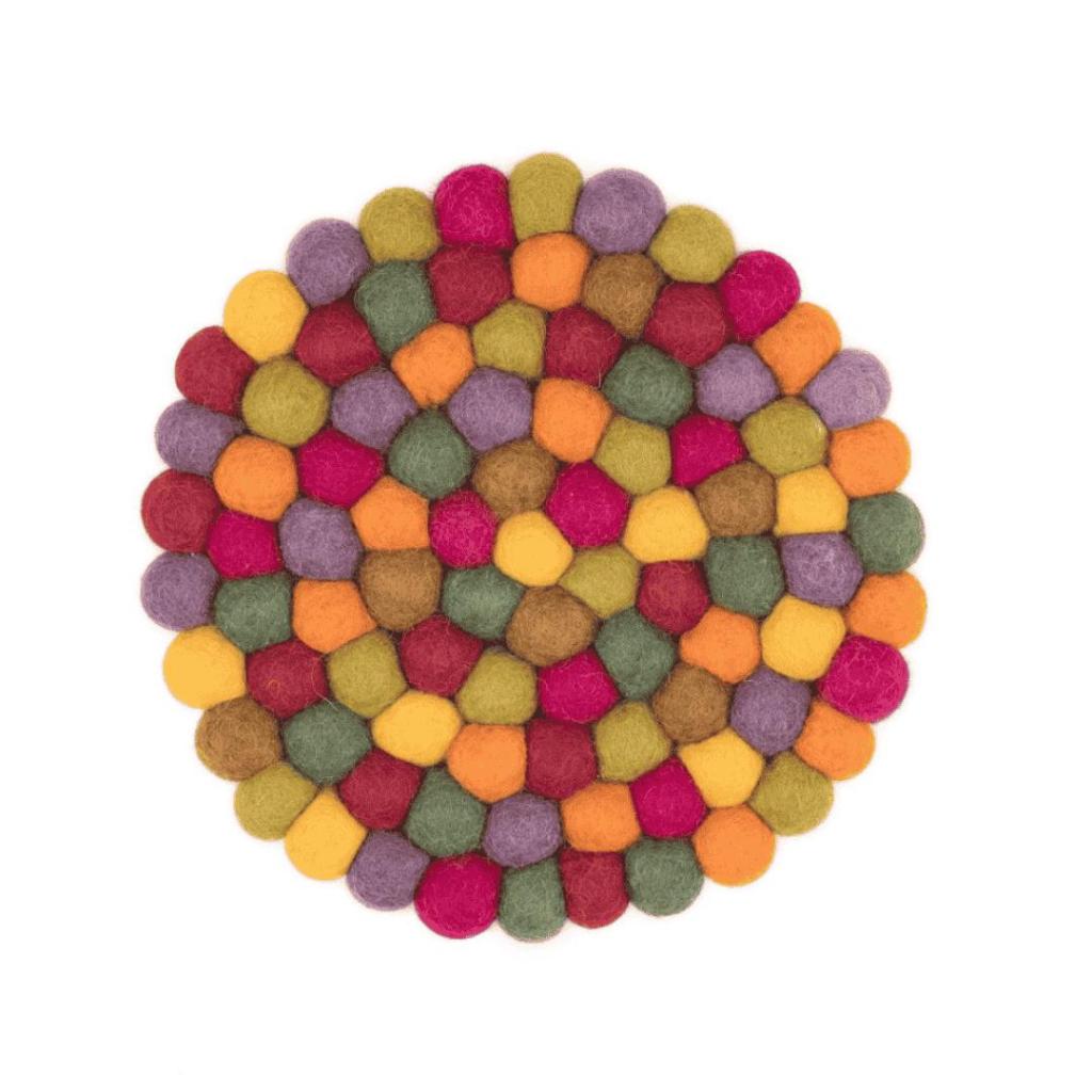 Breng warmte en sfeer in huis met deze ronde vilten onderzetter in het kleurthema Indian Summer. De onderzetter heeft een diameter van 20 cm en is opgebouwd uit zorgvuldig gevilte wolvilt balletjes in warme tinten zoals oker, rood, groen, lila en roest. Perfect als stijlvolle basis voor een mooie vaas, theepot of schaal.