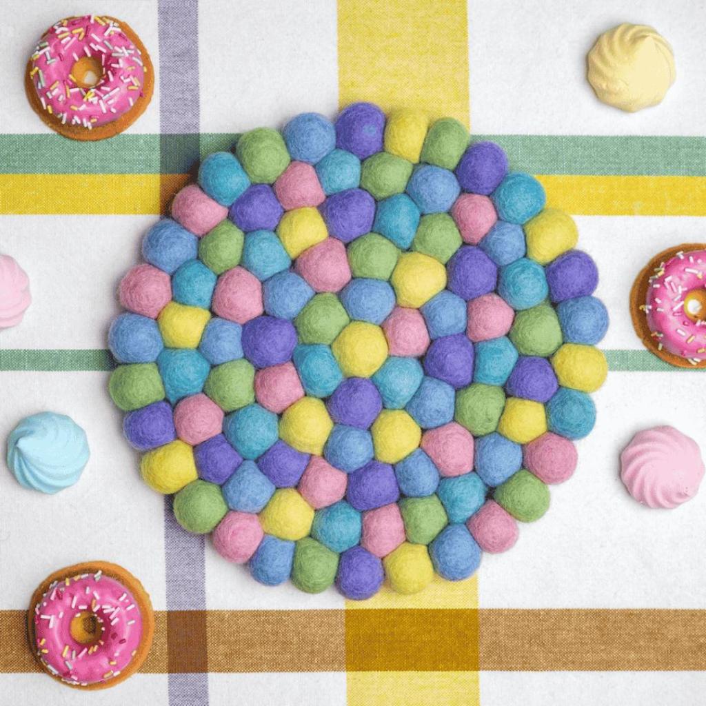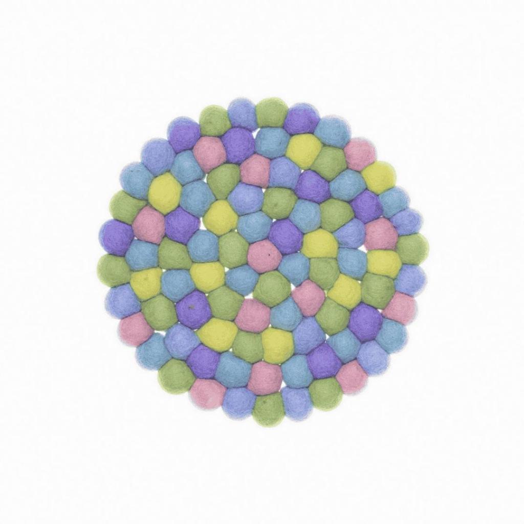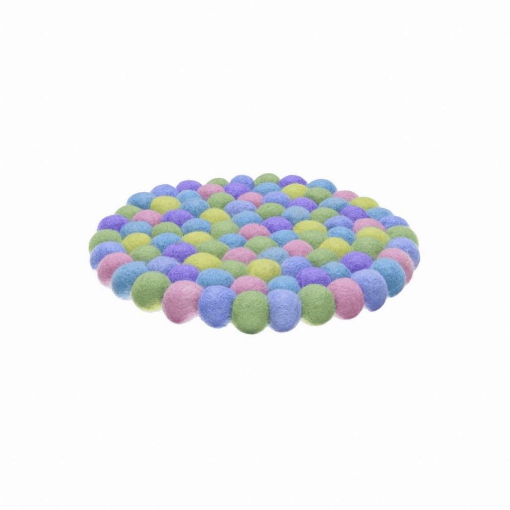 Breng een zachte en vrolijke sfeer op tafel met deze grote vilten onderzetter in pasteltinten. Met een diameter van 20 cm is hij ideaal voor een theepot, vaas of schaal. De onderzetter is opgebouwd uit tientallen kleine wolvilt balletjes in tinten zoals mintgroen, lila, lichtblauw, zachtgeel en roze. Een frisse en speelse eyecatcher voor elk interieur.