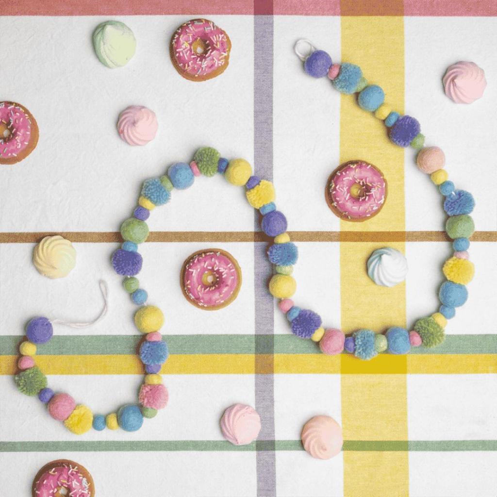 - Slinger van gekleurde vilten bolletjes en pompoms.