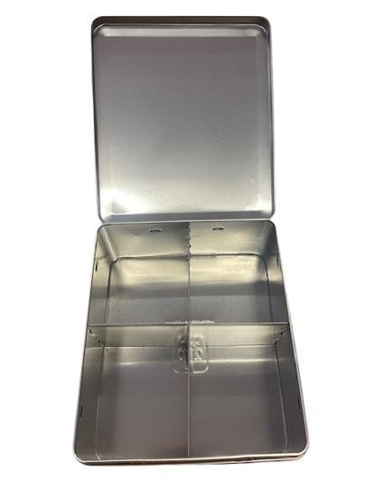 Het blik is van binnen verdeeld in vier vakken en is van een wat dikkere kwaliteit dan de meeste andere opbergblikken.