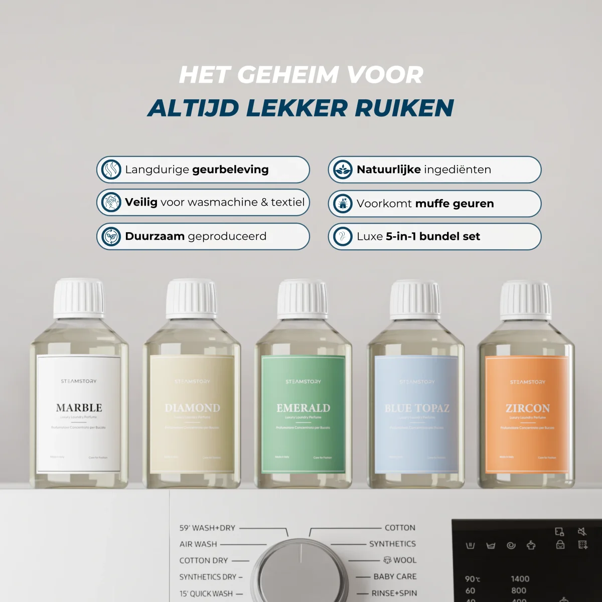 Deze bundle bevat vijf flessen van 250 ml luxueuze wasparfums, elk ontworpen om je kleding te doordrenken met langdurige frisheid en onweerstaanbare geur. Gemaakt met hoogwaardige geuren, elimineren onze parfums niet alleen onaangename geuren, maar laten ze ook een blijvend aroma achter dat je zintuigen betovert. Zeg vaarwel tegen saaie wasdagen en geniet van de heerlijke geurbeleving met onze Wasparfum Bundelset.