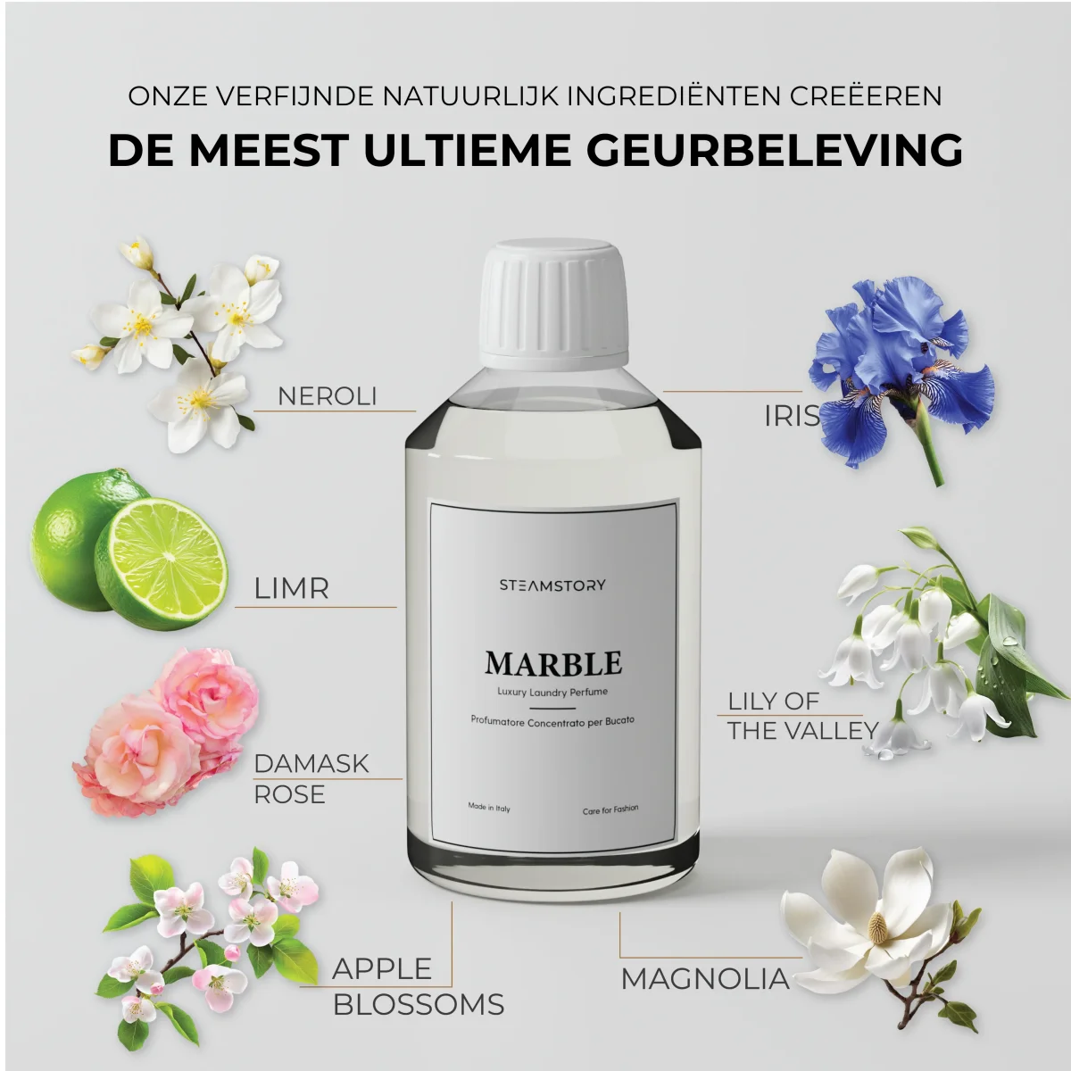 Marble’ van Steamstory betovert met een veelzijdige compositie die de zintuigen prikkelt. Verse limoen opent de geur met levendige energie, terwijl een boeket van appelbloesem, Rosa Taif, lelietje-van-dalen, magnolia en iris een betoverend hart vormt.