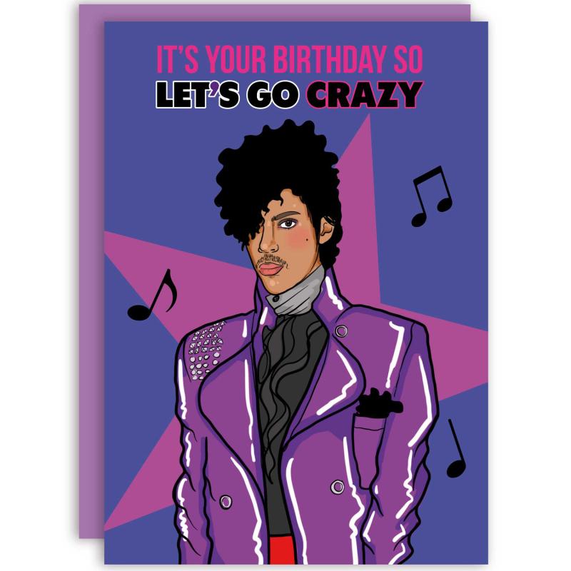 De Let’s Go Crazy verjaardagskaart van Studio Soph is een kleurrijke ode aan muziekicoon Prince. De illustratie toont de zanger in zijn kenmerkende paarse outfit, met de tekst “It’s your birthday so let’s go crazy” — een knipoog naar zijn beroemde hit.