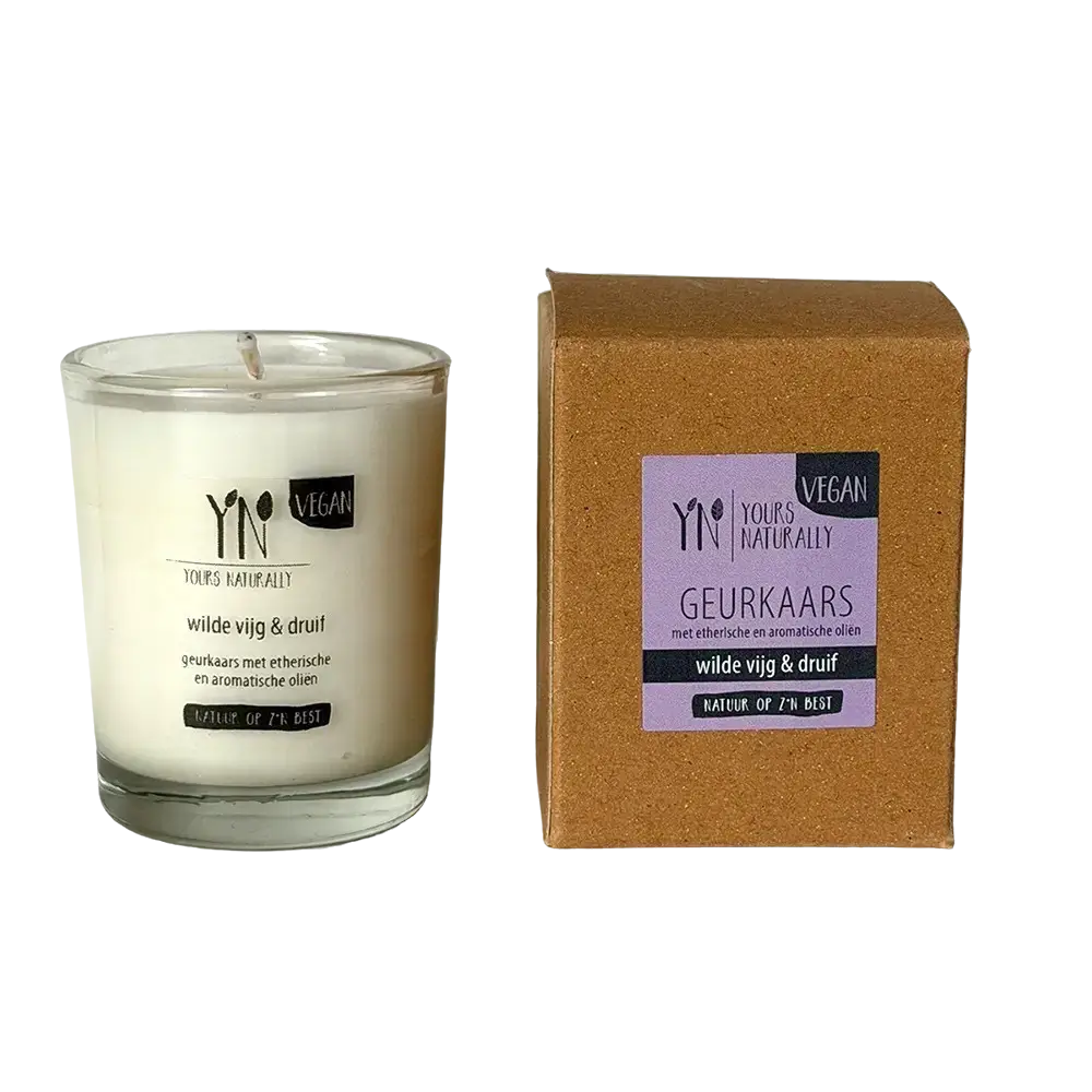 Plantaardige geurkaars in gerecycled glas met zoete vijg & druif geur, ±25 branduren, vegan & duurzaam.