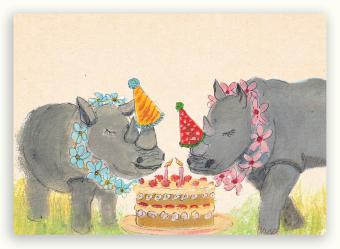 Een vrolijke en speelse Zintenz kaart met twee feestvierende neushoorns. Versierd met kleurrijke bloemenkransen en feesthoedjes staan ze samen voor een grote verjaardagstaart. Deze illustratie straalt warmte en gezelligheid uit en is perfect om iemand een fijne verjaardag te wensen.