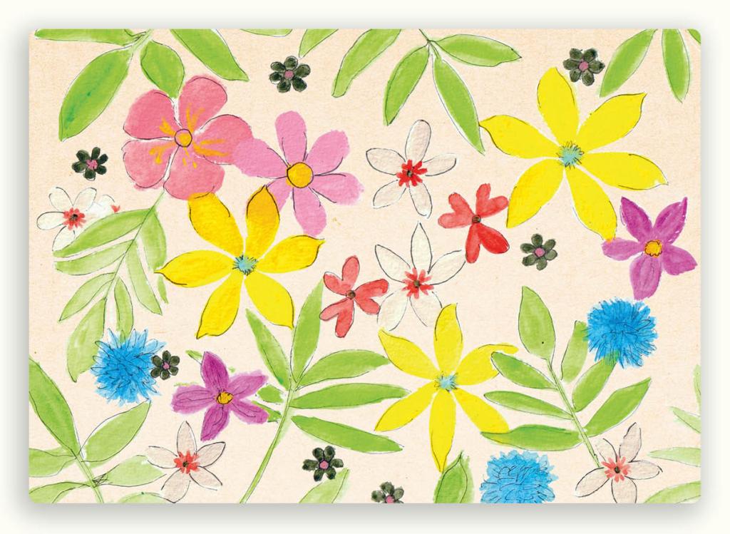 Een bonte verzameling bloemen in geel, roze, rood, blauw en paars siert deze levendige kaart. De frisse kleuren en speelse vormen maken hem perfect voor elke gelegenheid – van felicitatie tot oppepper, of zomaar, omdat het kan.
